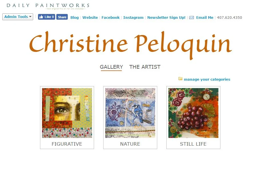 Daily Painting, Galleries, Shop Christine Peloquin 3/16/17 Daily Painting, Galleries, Shop Christine Peloquin 3/16/17 Dailypaintworks.com Read More Shop Christine Peloquin 2/13/17 Shop Christine Peloquin 2/13/17 Last Chance for the Valentine's Day Celebration Sale Read More Shop, Studio Christine Peloquin 2/1/17 Shop, Studio Christine Peloquin 2/1/17 Celebration Sale! Read More Shop Christine Peloquin 12/8/16 Shop Christine Peloquin 12/8/16 The Gift of Art Read More Studio, Shop Christine Peloquin 11/28/16 Studio, Shop Christine Peloquin 11/28/16 Off the Beaten Path: Art Studios Tour of Lake County Read More Studio, Shop Christine Peloquin 11/8/16 Studio, Shop Christine Peloquin 11/8/16 ART SPLASH: 6th Ave Art Studios Read More Workshops, Shop, Galleries, Studio Christine Peloquin 10/17/16 Workshops, Shop, Galleries, Studio Christine Peloquin 10/17/16 6th Avenue Studios is Opening! Read More Faces, Figures, Shop Christine Peloquin 7/1/16 Faces, Figures, Shop Christine Peloquin 7/1/16 New Line of Prints on Block Panels and Cigar Boxes Read More Faces, Shop Christine Peloquin 5/9/16 Faces, Shop Christine Peloquin 5/9/16 New Work...The Eyes Have It Read More Links, Suggested reading, Shop Christine Peloquin 2/24/16 Links, Suggested reading, Shop Christine Peloquin 2/24/16 Big Magic Read More Newer Posts Older Posts